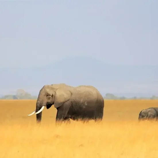 Desayuno. Saldremos de Nairobi rodeando su cinturón industrial para llegar a las áridas llanuras de Athi, en las inmediaciones de Kajiado. El matorral seco, salpicado de acacias espinosas de tipo "paraguas" nos anuncia la proximidad de la sabana africana. Tras pasar Namanga, en la frontera con Tanzania, un entorno semidesértico nos llevará hasta el Parque Nacional de Amboseli. Tipo de coche durante el safari. Almuerzo en el Lodge. Salida de safari a las 16.00 hrs. Amboseli es una enorme planicie de lapilli volcánico totalmente erosionado, dominado por la majestuosa cumbre del eternamente nevado Monte Kilimanjaro, cuyos casi 6.000 metros de altura convierten a este volcán apagado en el "techo de África". Pero curiosamente, y debido a la buena filtración de la roca volcánica, este árido paisaje posee varias zonas pantanosas cuyas aguas atraen a una extensa población estable de vida salvaje: gacelas, impalas, gerenuks, cebras, ñus, búfalos y leones, entre otros, encuentran en este duro entorno un hábitat adecuado, pero el mayor atractivo de este parque son los elefantes, con grandes manadas desplazándose en columna para permitirnos plasmar en nuestras cámaras bellas imágenes con el incomparable marco del Kilimanjaro. Cena, Alojamiento.